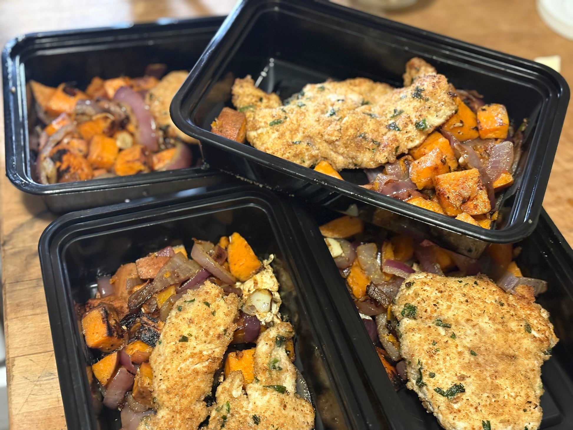 Over four weeks, you’ll create eight rosemary breaded chicken filet meals — four paired with garlic mashed potatoes and four with caramelized sweet potatoes and onions. You’ll prepare five rosemary breaded chicken nugget meals served with garlic mashed potatoes, and six chicken marinara pasta meals. That’s 19 complete meals from one pack of chicken.